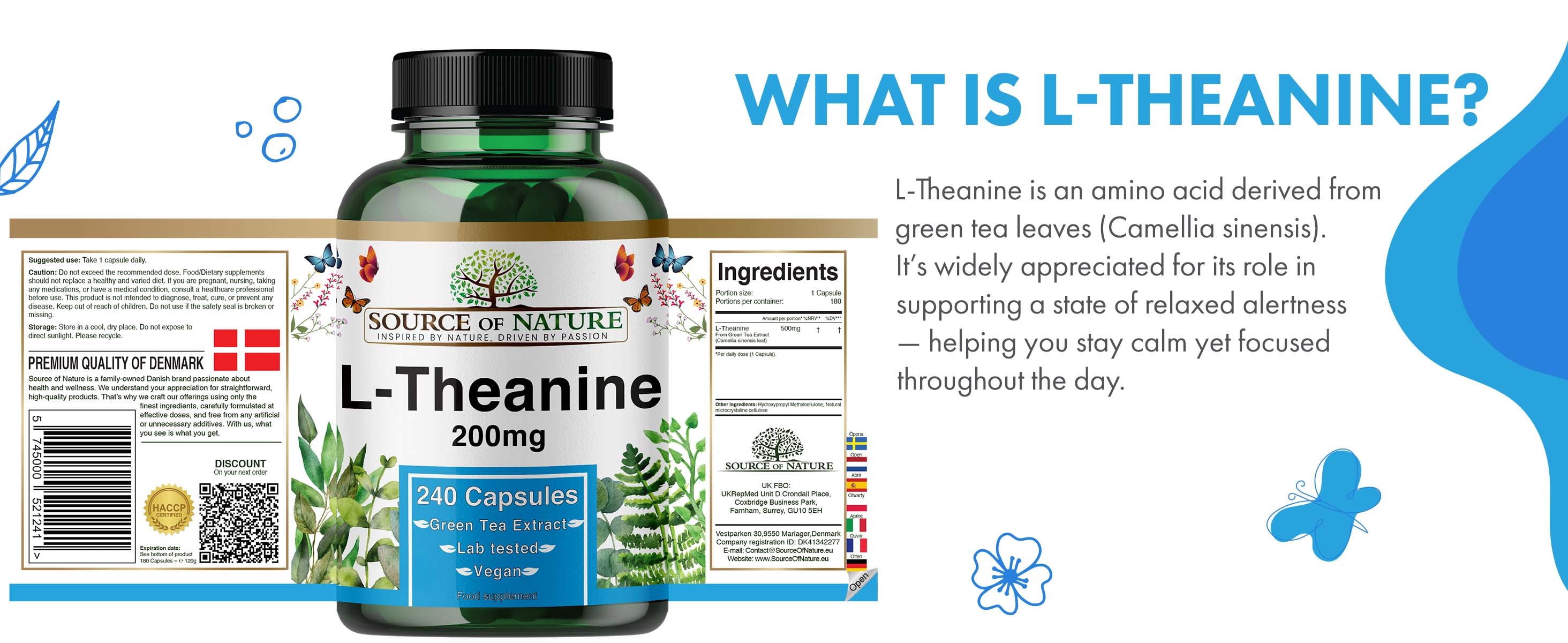 Source of Nature L-Theanine 200mg is a high-purity food supplement made with L-Theanine sourced from decaffeinated green tea extract. Each capsule delivers a precisely measured 200mg dose, providing consistent quality and easy daily use as part of a balanced wellness routine.