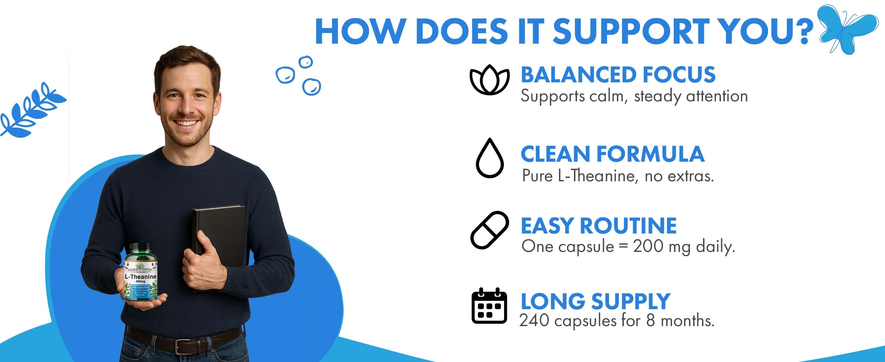 With its clean-label formulation, Source of Nature L-Theanine is free from unnecessary additives and produced under strict quality standards. This premium L-Theanine supplement is a convenient choice for anyone looking for a high-purity, simple ingredient profile in an easy-to-take capsule format.